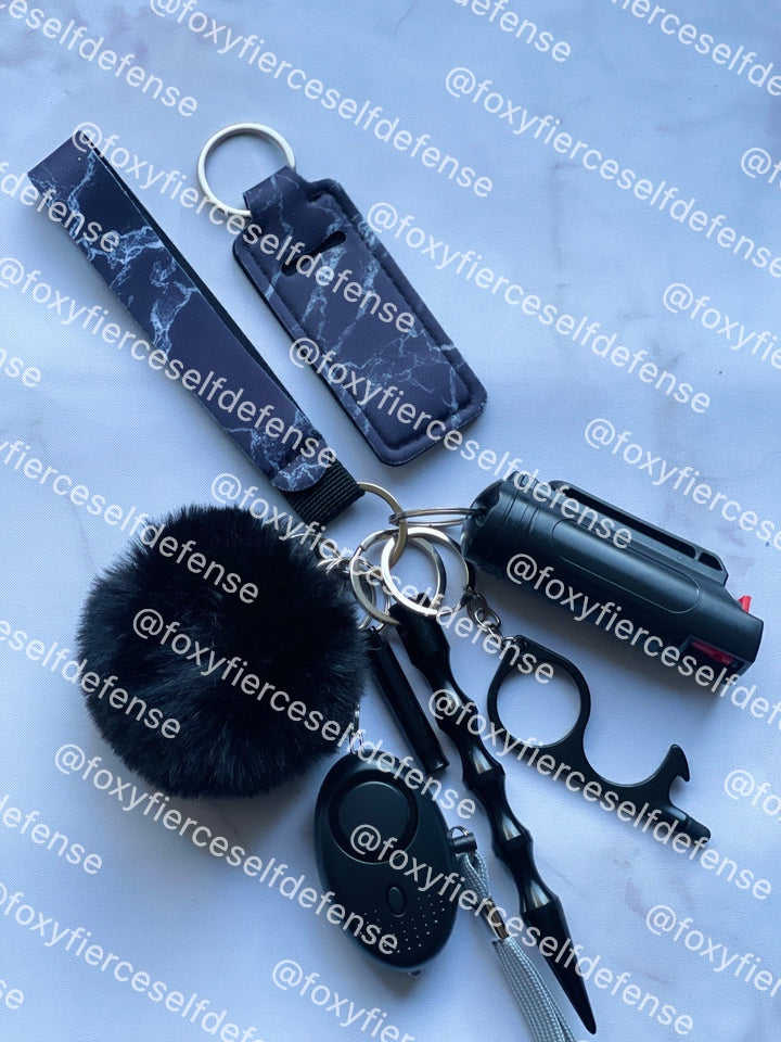 a handmade wristlet containing essential safety items. It includes a seatbelt cutter, window breaker, chapstick holder, and a kubaton for self-defense. A pompom and emergency whistle are also included for added protection. Optional pepper spray and hand sanitizer add an extra layer of security.