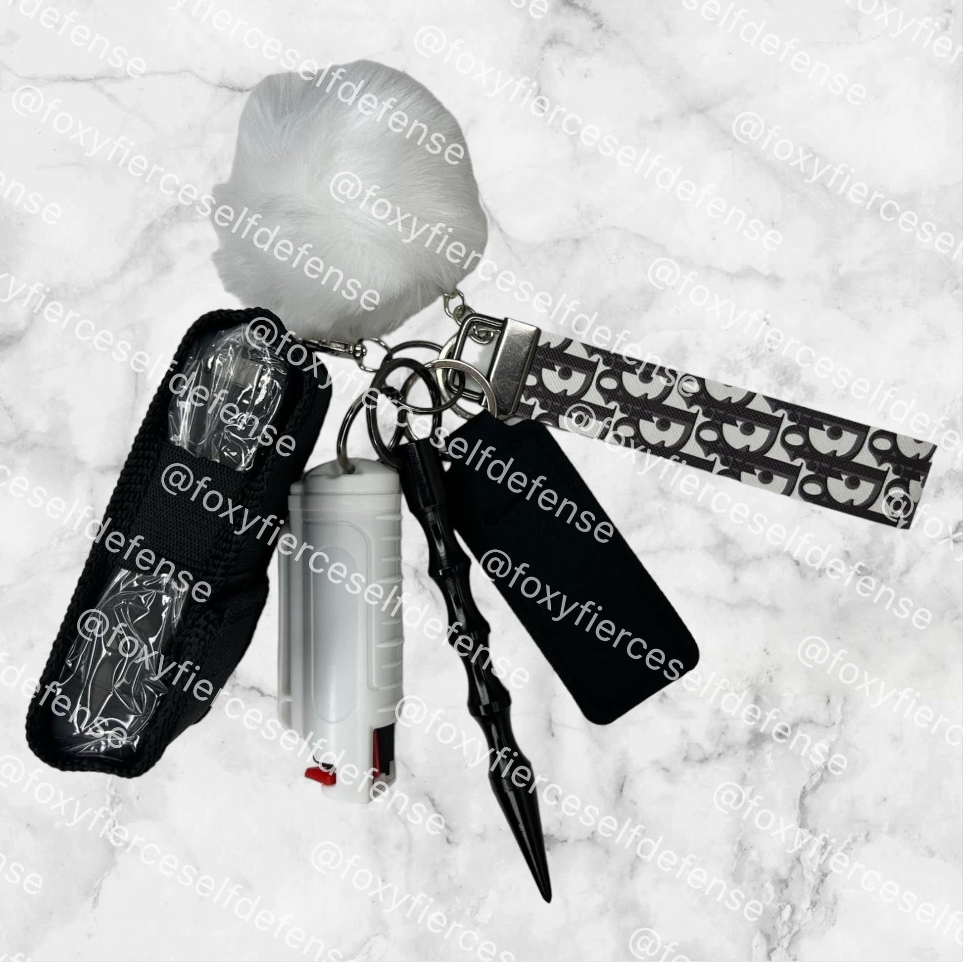 a handmade wristlet containing essential safety items. It includes a seatbelt cutter, window breaker, chapstick holder, and a kubaton for self-defense. A pompom and emergency whistle are also included for added protection. Optional pepper spray and hand sanitizer add an extra layer of security.