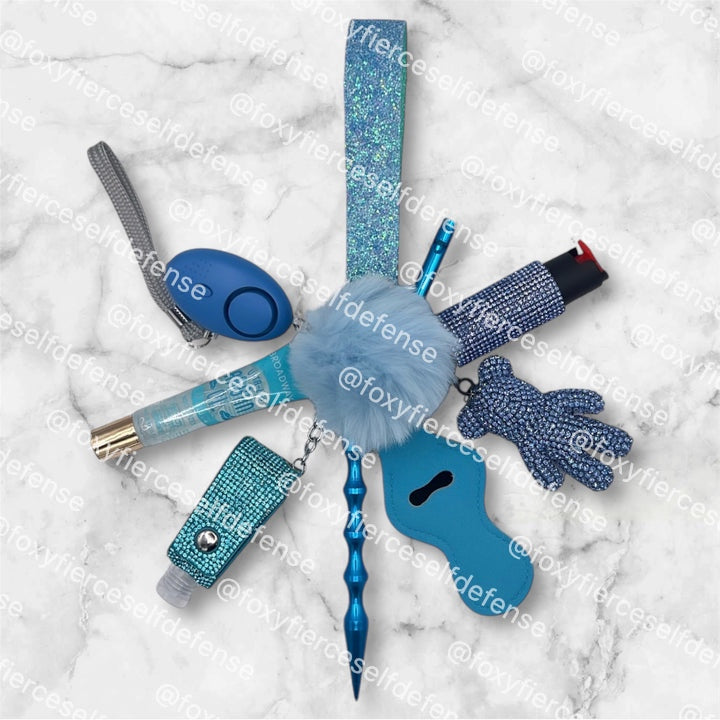 The Blue Hypnotic wristlet is the perfect accessory for keeping you safe and stylish. Get the convenience of an alarm/flashlight, kubaton, emergency whistle, lip gloss, hand sanitizer, chapstick, and pepper spray (optional) in one stylish handmade package. An adorable pompom and bling bear charm add a special touch.