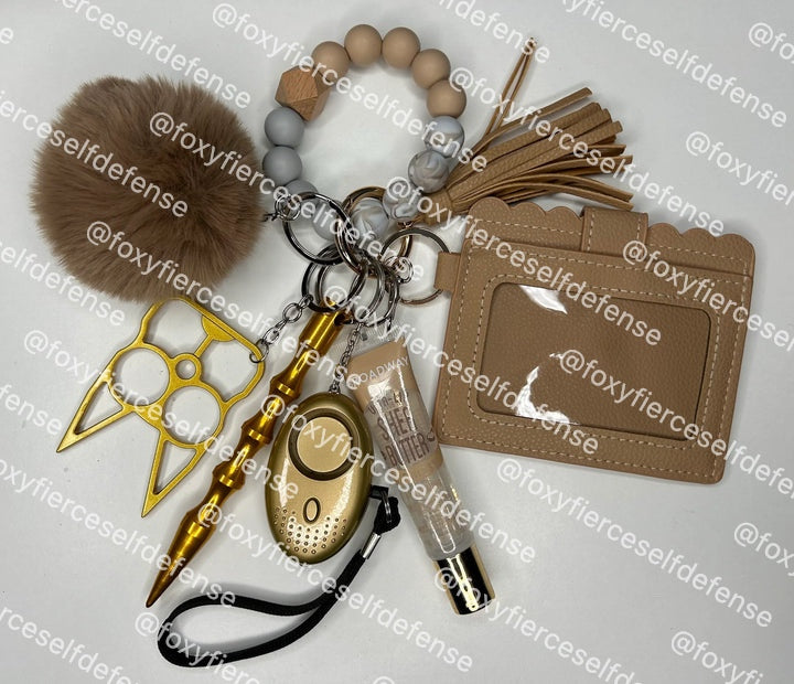 a handmade wristlet containing essential safety items. It includes a seatbelt cutter, window breaker, chapstick holder, and a kubaton for self-defense. A pompom and emergency whistle are also included for added protection. Optional pepper spray and hand sanitizer add an extra layer of security.