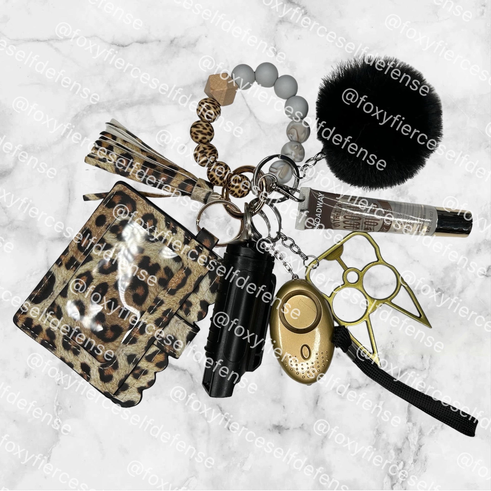 a handmade wristlet containing essential safety items. It includes a seatbelt cutter, window breaker, chapstick holder, and a kubaton for self-defense. A pompom and emergency whistle are also included for added protection. Optional pepper spray and hand sanitizer add an extra layer of security.