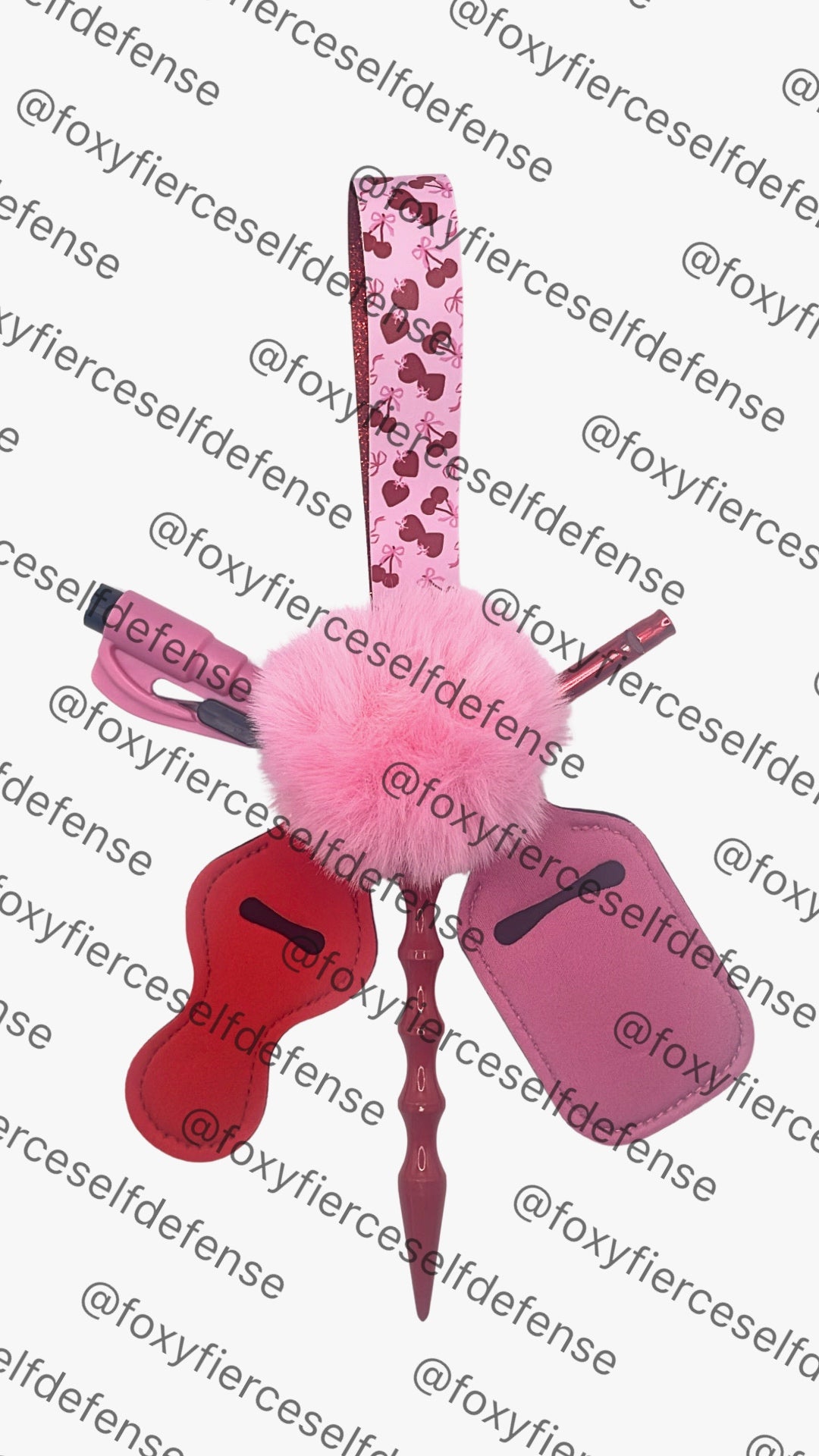 Designed for everyday carry, this safety keychain is built around a vibrant pink wristlet detailed with heart-shaped strawberries and cherries, finished with bow accents for a k handmade wristlet blending function with an intentional, fashion-forward feel. Finished with a soft pom-pom, it includes an emergency whistle, chapstick holder, hand sanitizer holder, seatbelt cutter/window breaker, and kubaton.