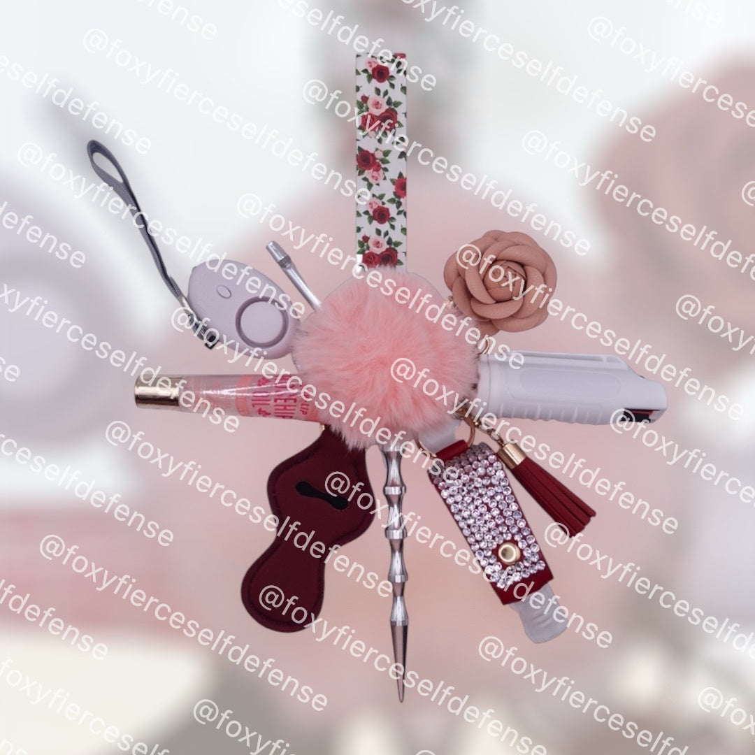 Introducing our Burgundy Flower wristlet, handmade with a pompom, kubaton and chapstick holder. Stay safe with optional pepper spray, alarm/flashlight, and emergency whistle. Add some style with a faux leather flower charm and bling hand sanitizer holder or bling pepper spray(add in the notes section at checkout if you want to customize)