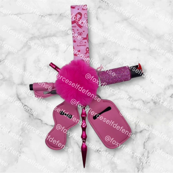 The Heart of Hope wristlet is a carefully crafted and essential safety accessory. It features a seat belt cutter/window breaker, Chapstick holder, Pompom, Kubaton, emergency whistle, and hand sanitizer. It also comes with an optional pepper spray and a Pink Ribbon charm for decoration. Feel secure and supported with all these essential items in one stylish and convenient package.