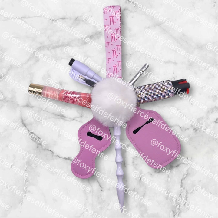 HER is a versatile and stylish safety keychain that offers more than just a pop of pink and glitter. Handmade with a pink bow design, it also includes a kubaton, chapstick holder, bling hand sanitizer holder, and an optional pepper spray for added protection. In case of emergencies, it also features a seat belt cutter/window breaker and an emergency whistle, along with a bling baby bear charm. Stay safe and fashionable with HER.