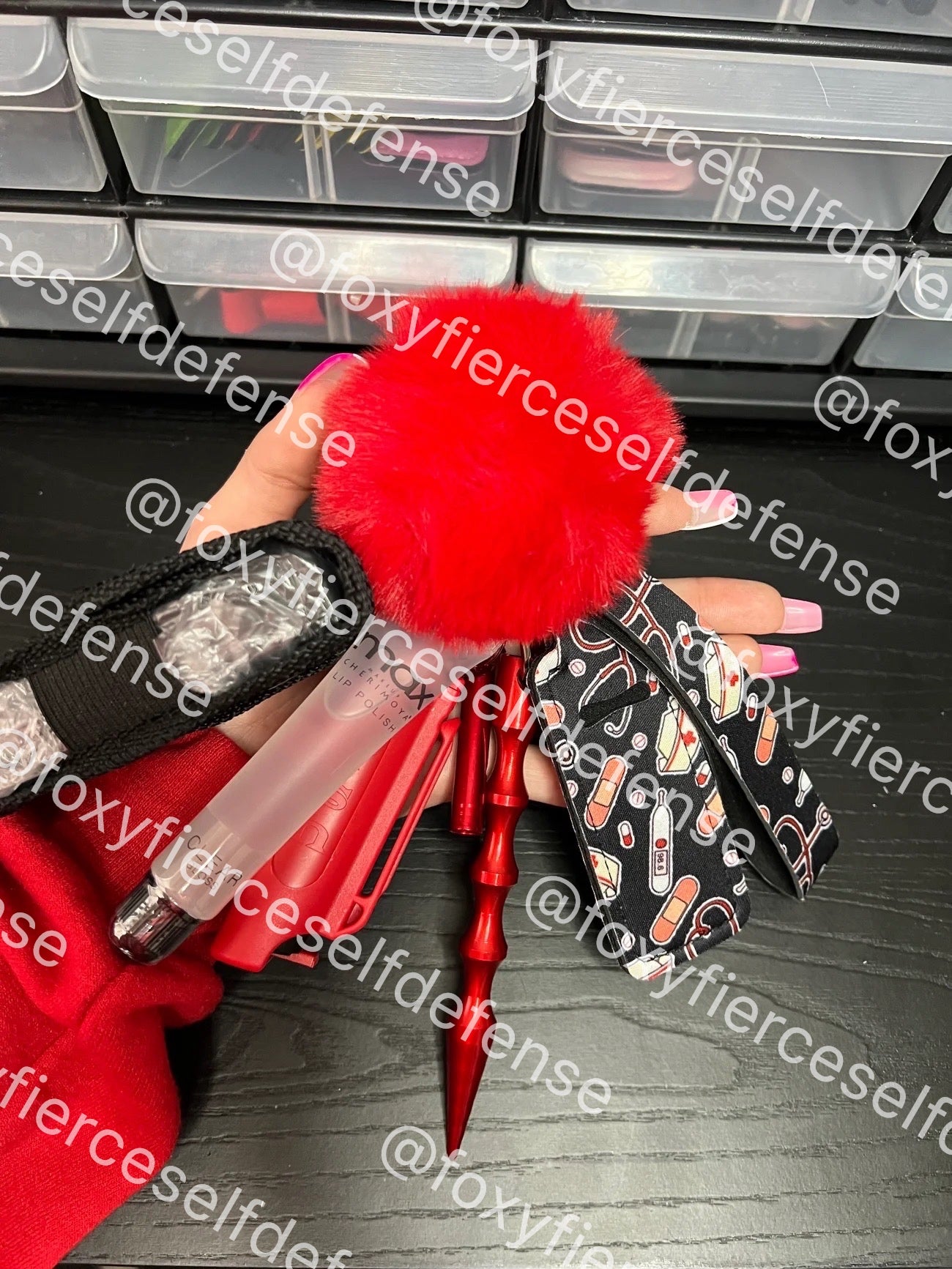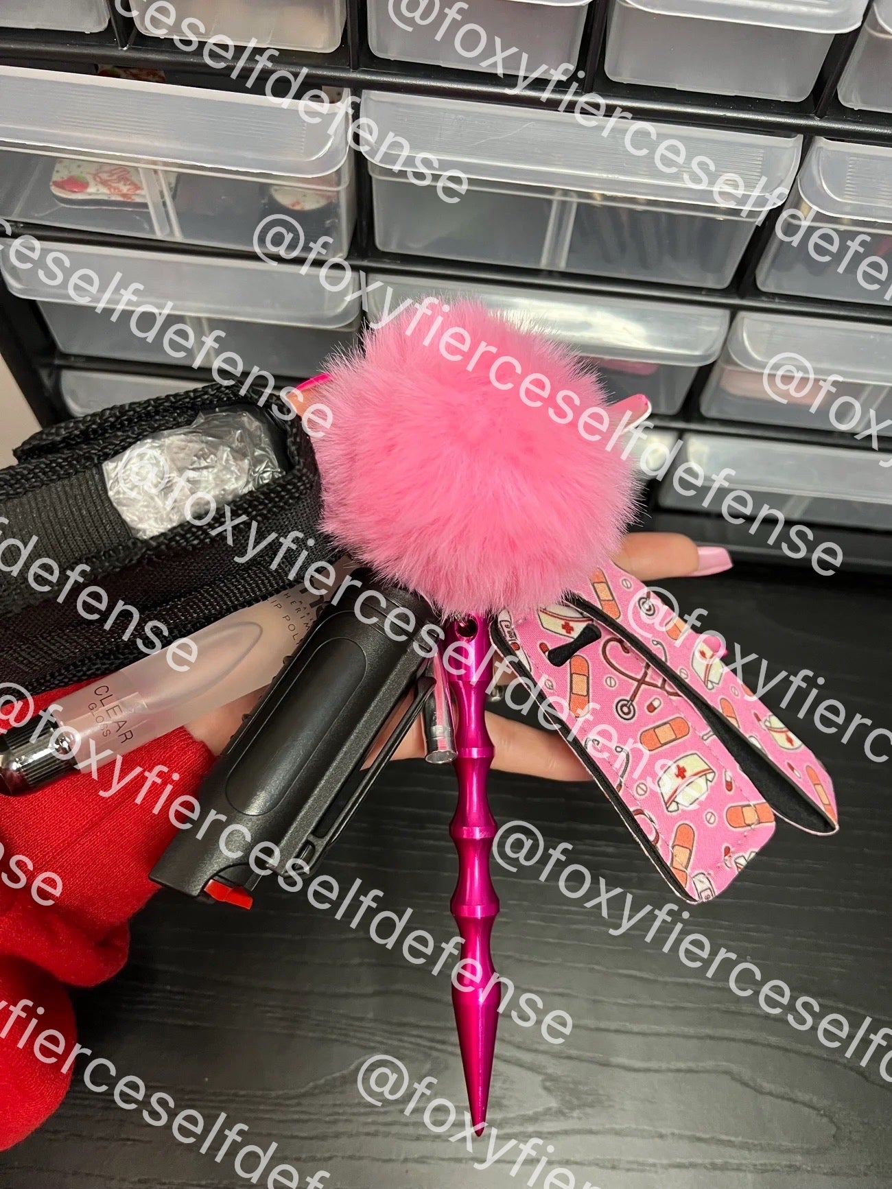 The Nurse wristlet is an expertly crafted accessory perfect for any situation. It features a seatbelt cutter window breaker and a chapstick holder (chapstick included). A detailed pompom and optional pepper spray add extra protection and flair. The wristlet also comes with lip gloss, a kubaton, an emergency whistle and a hand sanitizer. Keep safe and stylish with this essential accessory.