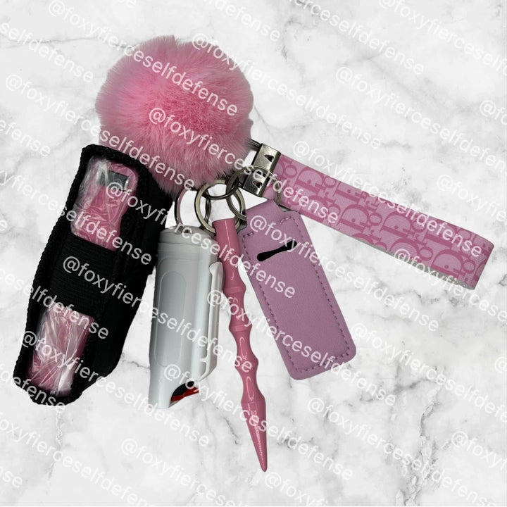 a handmade wristlet containing essential safety items. It includes a seatbelt cutter, window breaker, chapstick holder, and a kubaton for self-defense. A pompom and emergency whistle are also included for added protection. Optional pepper spray and hand sanitizer add an extra layer of security.
