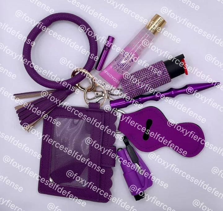 This Plum Kisses wristlet provides the perfect blend of security and convenience. It comes with a tassel, wallet, Kubaton, seat belt cutter/window breaker, ChapStick holder, whistle, and lip gloss. Optional pepper spray gives an extra layer of protection. Keep your essentials organized and secured in style.