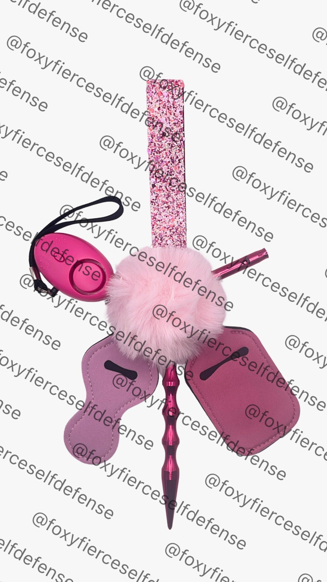 Designed for everyday carry, this safety keychain has a multicolored pink glitter wristlet that subtly glows under UV light, soft pom-pom, it includes an emergency whistle, chapstick holder, hand sanitizer holder, alarm/flashlight, and kubaton.