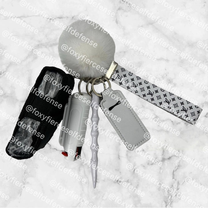 a handmade wristlet containing essential safety items. It includes a seatbelt cutter, window breaker, chapstick holder, and a kubaton for self-defense. A pompom and emergency whistle are also included for added protection. Optional pepper spray and hand sanitizer add an extra layer of security.