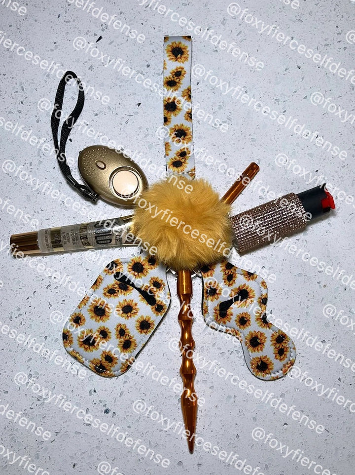 a handmade wristlet containing essential safety items. It includes a seatbelt cutter, window breaker, chapstick holder, and a kubaton for self-defense. A pompom and emergency whistle are also included for added protection. Optional pepper spray and hand sanitizer add an extra layer of security.
